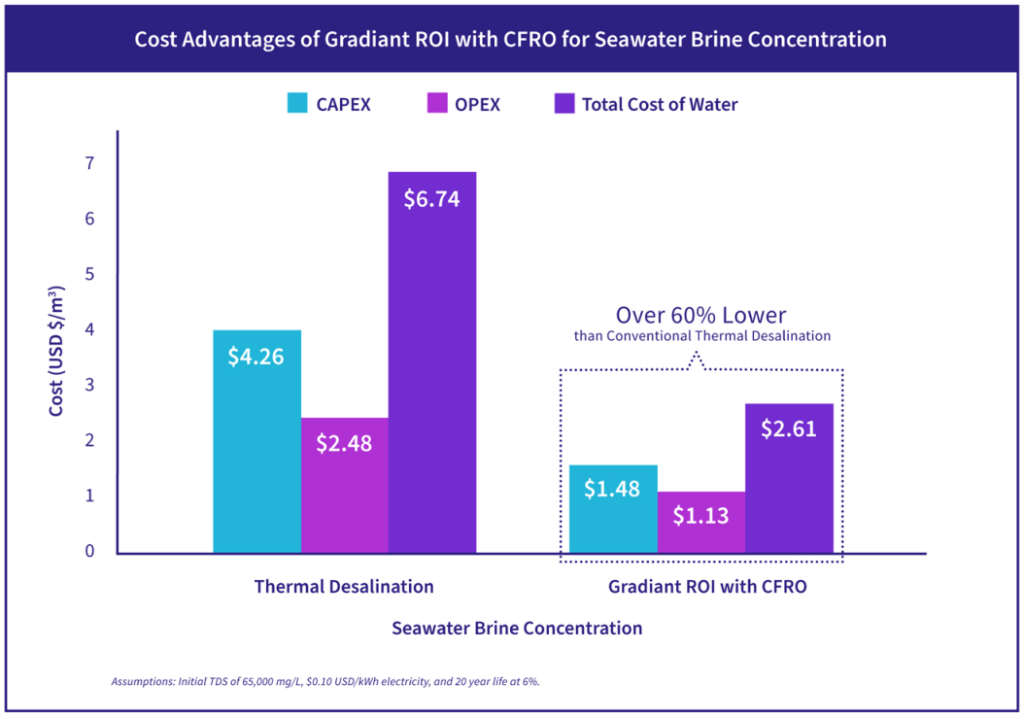 Outre les économies de coûts d'investissement évitées, puisqu'aucune nouvelle infrastructure ne sera nécessaire, la solution de Gradiant permettra à SAWACO de réaliser d'importantes économies en termes de coûts d'exploitation et de coûts totaux de l'eau. La consommation d'énergie spécifique de la technologie RO Infinity est une fraction de celle de la concentration de la saumure à l'aide de technologies thermiques conventionnelles.