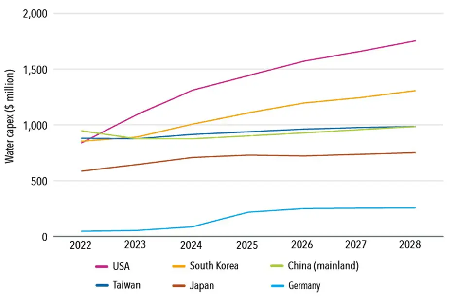 Mentre si prevede che l'impianto di Magdeburgo di Intel produrrà i chip più piccoli in Europa, i requisiti idrici di altri impianti avanzati, come l'imminente impianto di TSMC che produrrà chip a 12 nm, rappresentano ancora opportunità significative per i fornitori di UPW. Considerando che la domanda di chip in Europa è fortemente trainata dai nodi tipicamente più grandi dell'industria automobilistica, è improbabile che si verifichi uno spostamento completo verso i nodi più piccoli. Tuttavia, un notevole spostamento verso nodi più avanzati e fabbriche più grandi sta facendo progredire il fabbisogno idrico del settore.