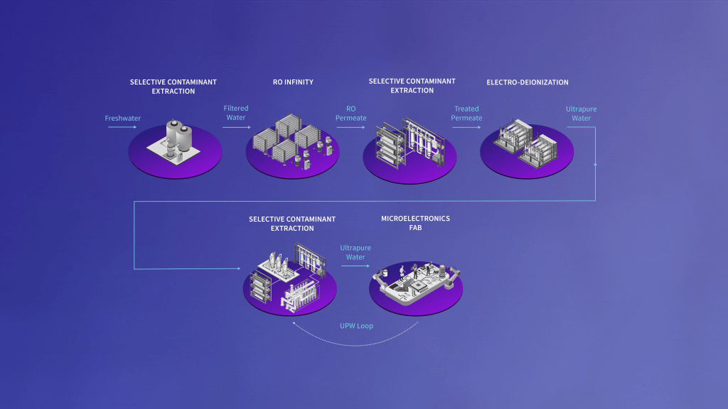 Gradiant utilizza una combinazione di tecnologie brevettate, tra cui l'estrazione selettiva dei contaminanti (SCE) e RO Infinity (ROI), in combinazione con l'elettrodeionizzazione (EDI) per gli stadi di reintegro, primario e di lucidatura per produrre UPW in modo affidabile.