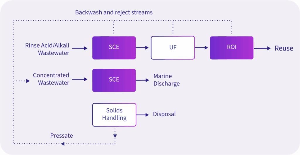Backwash, reject, and filter waste streams were combined in a concentrated wastewater treatment process to meet requirements for marine discharge. Solids waste handling systems then further treat waste solids for off-site disposal.