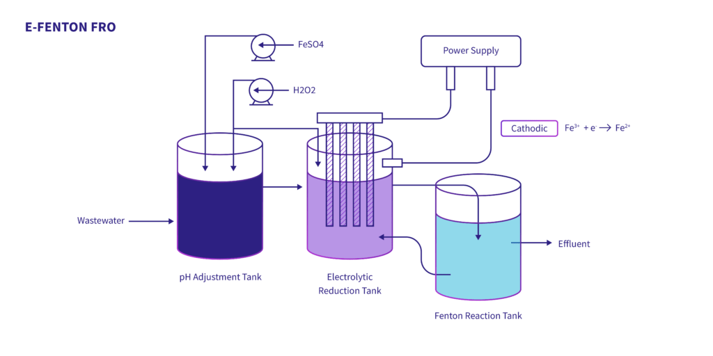 AOPs are in-situ treatment technologies that use hydroxyl radicals, the ultimate oxidant, for removal of organic contaminants in wastewater. These are highly effective methods to accelerate the oxidation process. AOP can be combined with components such as ozone, hydrogen peroxide, sulphate, and E-Peroxone to offer powerful treatment of wastewater. FRO technologies can treat up to 50,000 mg/L of COD consistently and cost-efficiently.