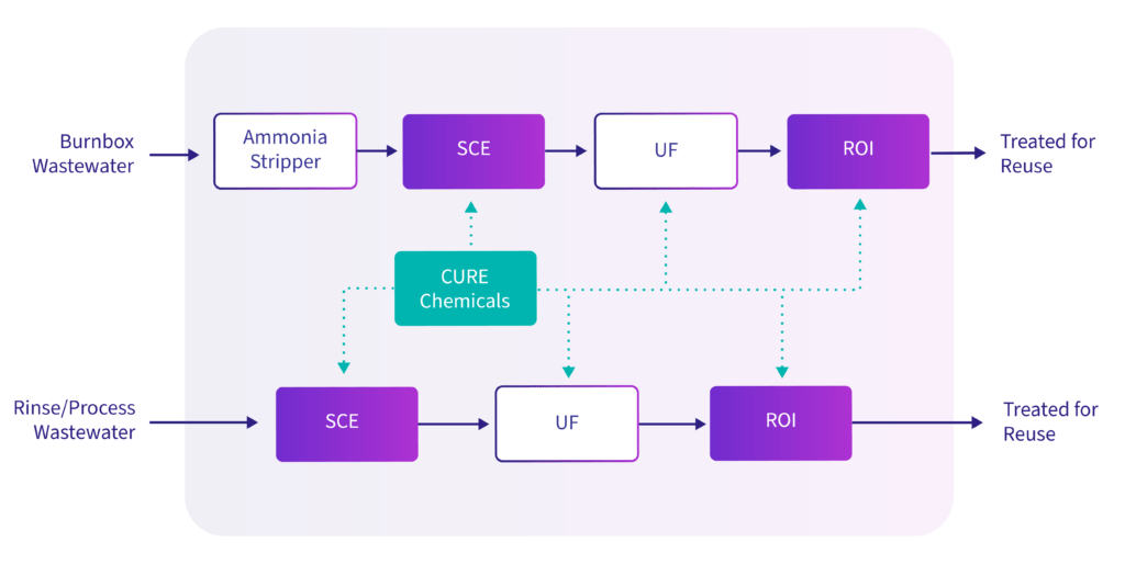 Gradiant 為製程和焚化爐廢水流創建了兩個流程圖,結合選擇性污染物萃取 (SCE) 和逆滲透 Inifinty (ROI) 技術,用於去除氨和氟化物,以及處理現場回用水。 Gradiant 還提供化學品和運作維護服務,以確保穩定可靠的運作。